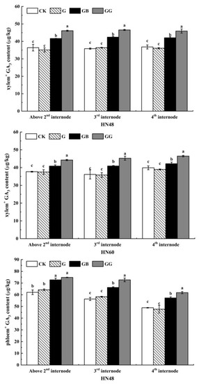 A comparison of the GA3 content in the phloem+ of plants among the four treatments showed a higher phloem+ GA3 content in the upper part of the second internode of the plants in the GG treatment compared with the GB treatment, but the results of the two treatment groups did not differ significantly. Compared with those in the G and CK treatments, the plants in the GG and GB treatments presented significantly higher phloem+ GA3 contents, while the content in the plants in the G treatment and CK treatment did not differ significantly. In terms of the phloem+ GA3 content in the third and fourth internodes of plants, compared with the GB, G, and CK treatments, the GG treatment resulted in significantly higher levels, and compared with the G and CK treatments, the GB treatment resulted in significantly higher levels; however, the contents did not differ significantly between the G treatment and the CK treatment. Taken together, these results showed that the application of GA3 to the xylem and stem cortex increased the GA3 content in the phloem+ of the internodes above the girding site, indicating that GA3 in the stem was transported in both directions through the xylem and phloem. Combining the results shown in Figure 2 and Figure 3, we found that the pattern of changes in internode length was essentially consistent with the pattern of changes in GA3 content, indicating that the GA3 content in the stem is an important factor affecting stem elongation.