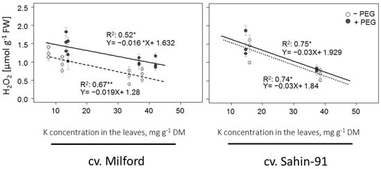 Relationship between H2O2 and K concentrations in the fully expanded young leaves of two barley cultivars (Sahin-91 and Milford) grown under osmotic stress (filled circles) and no osmotic stress (open circles). Standard errors are depicted on the symbols (n = 3). Stars on r squared values show the significance at the level of 0.05 (*) and 0.01 (**).