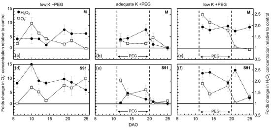 Temporal course of H2O2 and O2− concentration in the youngest fully expanded young leaves of two barley cultivars (Milford, M; Sahin-91, S91) grown in the nutrient solution under two levels of K supply (adequate K: 0.8 mM K+; low K 0.04 mM K+) without and with a PEG-induced water deficit (−PEG; +PEG) 5–25 days after the onset of K treatments (DAO). The letters (a–f) represent each single combination of K-level × PEG-level × barley-variety. On each sampling day, values of the treatments “low K −PEG”, “adequate K +PEG” and “low K +PEG” are expressed as fold changes in comparison to control (“adequate K −PEG” = 100%, represented by the solid horizontal line in each plot). Symbols represent means ± SE (n = 6). Significant differences of the measurements are provided in the appendix (Table A1).