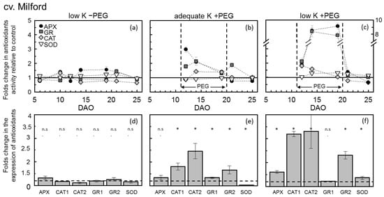 In our study, the activity of most antioxidants or the expression level of related genes were triggered by osmotic stress. Here, the plants provided with sufficient K compared to the K-deprived plants showed lower ROS levels, and therefore, less antioxidant activity. This indicates that K supply under osmotic stress conditions favors mechanisms that mainly avoid and minimize ROS generation (e.g., enhanced photosynthesis activity and better osmoregulation) while simultaneously allowing steady ROS levels to persist in maintaining redox-signaling stress pathways [].