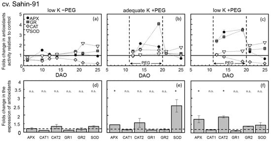 In Sahin-91, CAT activity levels under low-K supply were constantly below control levels. The SOD activity levels were more or less constant until day 19, which increased significantly afterward compared to the control (Table 2 and Table 3). Similar to the results observed from the activity of antioxidants in low-K treatment, the antioxidant gene expressions in both cultivars showed no changes in expression (Figure 3d and Figure 4d) at the mid-stage of the experiment (14 DAO). The absolute values of ROS and antioxidant enzymes during the whole experimental period are provided in the appendix (Table A1).