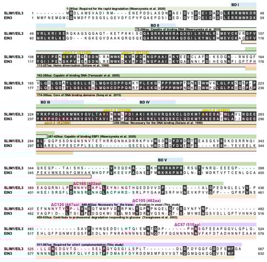 Alignment of SLIM1 and EIN3 proteins in Arabidopsis thaliana. Alignment of full protein sequences was performed by the ClustalW program at the DNA Data Bank of Japan (DDBJ) (http://www.ddbj.nig.ac.jp/search/clustalw-j.html, accessed on 8 May 2017). Amino acid residues conserved between SLIM1 and EIN3 are shown with white characters and dark gray background. Predicted DNA binding domains (BD I to BD V) are shown with pale blue bars. Yellow and brown characters indicate the positions of slim1 mutations (slim1-1, slim1-2, slim1-3, and slim1-4) and ein3-3 mutation, respectively. Magenta characters show the last amino acid in each C-terminal truncated form of SLIM1. Green and orange bars describe existing knowledge about domain structures of SLIM1 and EIN3, respectively. Violet bars highlight the findings in this study.