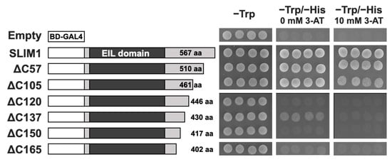 Trans-activation of HIS3 gene expression in yeast. The left panel shows the schematic representations of SLIM1 proteins fused to the GAL4 DNA-binding domain (BD-GAL4). Empty: no insertion, SLIM1: full-length SLIM1, ΔC57, ΔC105, ΔC120, ΔC137, ΔC150, and ΔC165: C-terminal truncated forms of SLIM1 lacking the C-terminal 57, 105, 120, 137, 150, and 165 amino acids, respectively. BD-GAL4: DNA binding domain of yeast GAL4 protein. Four independent colonies obtained from each plasmid transformation of yeast strain AH109 were spotted on the minimal SD agar medium lacking Trp (−Trp) or Trp and His (−Trp/−His) with or without 10 mM 3-amino-1,2,4-triazole (3-AT). The right panel shows the yeast growth at 30 °C for 3 days after spotting.