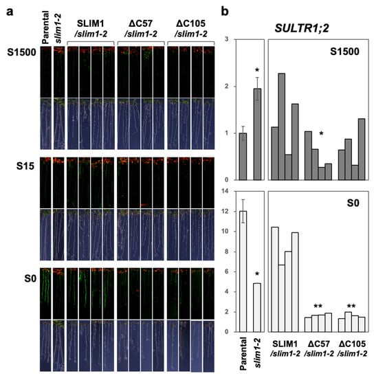 The T2 progenies of SLIM1/slim1-2, ΔC57/slim1-2, and ΔC105/slim1-2 transgenic lines, and the parental line and slim1-2 plants were vertically grown for 10 days on the agar medium [] supplied with 1500 µM (S1500), 15 µM (S15), or 0 µM (S0) sulfate at 22 °C and 16 h/8 h light (40 µmol m−2 s−1) and dark cycles.