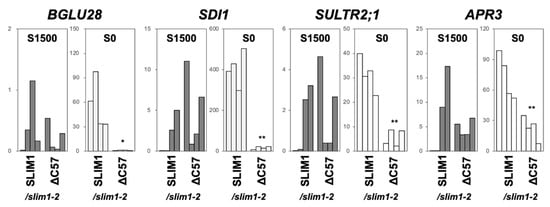 Transcript levels of −S-responsive genes in the complemented lines. Transcript levels of BGLU28, SDI1, SULTR2;1, and APR3 in the roots of four independent lines of SLIM1/slim1-2 and ΔC57/slim1-2 were determined by qRT-PCR with the same root-derived RNA used for the SULTR1;2 transcript expression analysis in Figure 3b. Asterisks indicate significant differences between SLIM1/slim1-2 and ΔC57/slim1-2 in S1500 and S0 conditions (Student’s t-test; ** p < 0.01, * 0.01 ≤ p < 0.05).