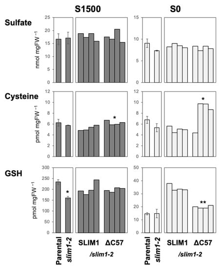 To gain further insights into the −S-responsive phenotypes affected by the C-terminal 57 aa deletion (ΔC57), we analyzed the tissue sulfate, cysteine, and GSH levels. Sulfate levels were not different among the plant lines under both S1500 (S-sufficient) and S0 (−S) conditions (Figure 5). Cysteine levels were similar between the parental line and slim1-2 but slightly increased in ΔC57/slim1-2 compared to SLIM1/slim1-2 under both S1500 and S0 conditions. GSH levels were lower in slim1-2 than in the parental line under S1500 and lower in ΔC57/slim1-2 than in SLIM1/slim1-2 under S0 conditions (Figure 5). These results suggest that sulfate assimilation is restored by overexpression of the full-length SLIM1 to complement slim1-2 under −S, but not with the C-terminal truncated form ΔC57.