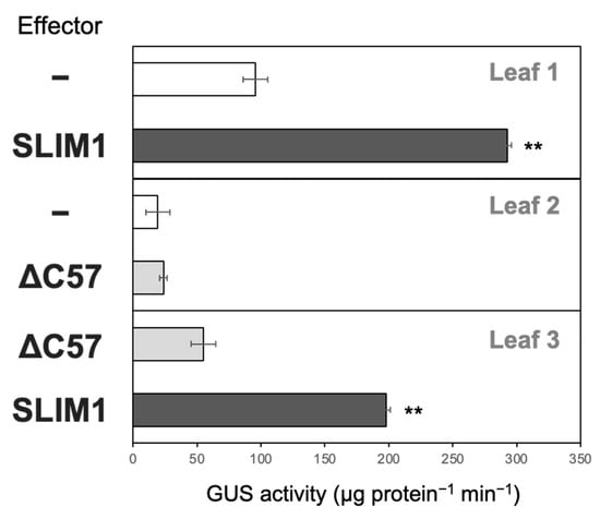 pH35GS-SLIM1 and pH35GS-ΔC57 were used as the effector plasmids. For the reporter plasmid, we inserted SHM7/MSA1 promoter sequence (569 bp upstream of ATG) amplified by PCR using the A. thaliana genomic DNA and primers, F: 5′-CACCTACCATAGTCCAACTCCATCC-3′ and R: 5′-ACGTTGAAGATGATGAAGATTTGG-3′, into NotI and XbaI sites of the modified pGreenII0029 binary vector [] and validated the sequence. The trans-activation assay was performed as previously described []. In brief, the reporter plasmid (SHM7/MSA1 promoter-GUS), and the effector plasmids (pH35GS-SLIM1 and pH35GS-Δ57) were introduced into the A. tumefaciens strains LBA4404 and GV3101, respectively. After over-night growth of A. tumefaciens cultures at 28 °C, the cells were collected by centrifugation and resuspended in water to an OD600 = 0.1 (reporter plasmid) or 0.4 (effector plasmids). The same aliquots of resuspended cells were mixed and infiltrated to three well-expanded leaves of 5-week-old N. benthamiana plants using 2 mL needleless syringes. Samples were collected for protein extractions 72 h after leaf inoculation and used for the quantitative GUS assay. The three leaf discs (8 mm diameter) collected from three different leaves were extracted with buffer (100 mM sodium phosphate pH 8.0, 10 mM EDTA, 14 mM ß-mercaptoethanol, 0.1% Triton X-100) and centrifuged at 11,000× g for 5 min at 4 °C. Soluble protein level was quantified using the Bradford method []. GUS activity was measured as the absorbance at 415 nm after mixing 10 µL of extract and 140 µL of the extraction buffer containing 1 mM PNPG (p-nitrophenyl-ß-D-glucuronide) and incubating the mixture at 37 °C for 30 min. The data were normalized with the absorbance of the sample without PNPG. The activity was calculated as µmol processed substrate mg−1 total soluble protein min−1.