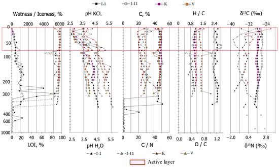 The Eastern European permafrost peatlands have a more acidic pH (pHH2O = 4.5 ± 0.5 and pHKCl = 3.6 ± 0.4) in comparison with the pH levels found in the Western Siberian peat plateaus (4.7 ± 0.5 and 3.7 ± 0.4, respectively) []. The pH values thus increase down the peat strata. The mean organic carbon content is 48.5 ± 1.8, and the minimum values can be explained by the predominance of weakly decomposed wood residues in the peat (Figure 1). Nitrogen concentrations form a wider range, from 0.8 to 4.9, with an average value of 2.5 ± 0.5. Peat deposits have minimal ash content, at 94.7 ± 1.8, except for individual horizons which have a large amount of weakly decomposed wood and moss remnants. Moreover, in the Eastern European peatlands, the ash content gradually increases, whereas in Western Siberia, its values are rather heterogenic throughout the profile.