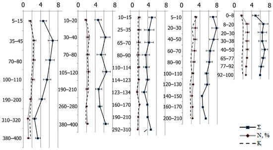 The biological soil activity can be illustrated using the molar fraction ratio of hydroxy and heterocyclic AAs, and this ratio can be a humification depth marker. A significant correlation is found between the molar concentration of this coefficient and the values of the δ15N, the soil’s organic nitrogen, and the C/N ratio were r = 0.66, 0.51, and −0.47, n = 42, p < 0.05, respectively (Figure 2).