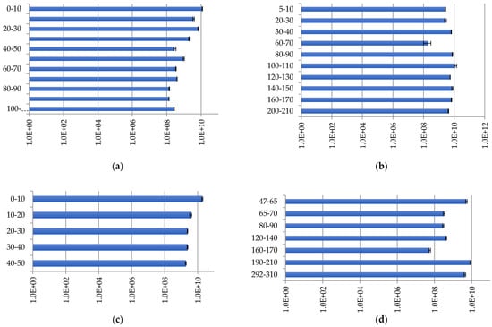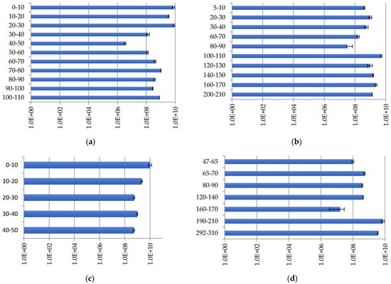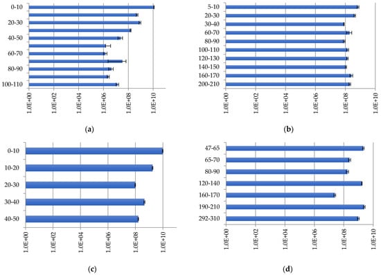 Bacterial distribution (copies/g of soil) in peat strata: (a) Inta 1; (b) Kolva; (c) Inta 11; and (d) Voda-Ty.
