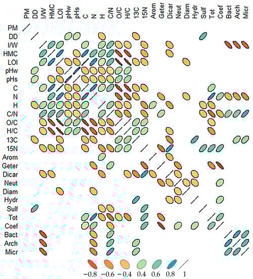 Pearson correlation coefficients between the amino acid composition, microbial community structure and the main physico-chemical peat properties. PM—plant macrofossils; DD—decomposition decree; %, I/W—Iciness/Wetness; HMC—Hygroscopic moisture coefficient; LOI—loss of ignition, %; pHw—pH H2O; pHs—pH K2O; C—soil’s organic carbon, %; N—soil organic nitrogen, %; H—total hydrogen, %; C/N—C/N ratio; O/C—O/C ratio; H/C—H/C ratio; 13C—δ13C, ‰; 15N—δ15N, ‰; Arom—Aromatic; Geter—Heterocyclic; Dicar—Dicarboxylic; Neut—Neutral, Diam—Diaminoacids; Hydr—Hydroxyacids; Sulf—Sulfur; Tot—Sum of amino acids; Coef—the mole fraction ratio of hydroxy AAs to heterocyclic AAs; Bact—Bacteria, copies per gram of peat; Arch—Archaea, copies per gram of peat; Micr—Micromycetes, copies per gram of peat.