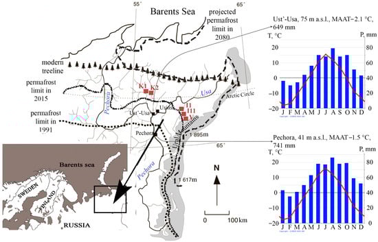 The research area is located within the northern treeline and southern border of the modern cryolithozone, which hosts a massive island permafrost (Figure 7). Mean annual temperatures vary from −1.5 to −3 °C, and mean annual precipitation fluctuates from 600 to 800 mm. Except in the Ural Mountains, the study area is covered by flat wetlands, with elevations from 40 to 160 m above sea level, which are underlain by Upper Neopleistocene glacial and lacustrine deposits. According to IPCC reports [], this region is most vulnerable to climatic and/or anthropogenic changes. The key study sites were selected according to the comparative geographical principle, taking into account the current and predicted geocryological situation in the study area. Sites Voda-Ty (V) and Inta (I) are located in the extreme northern taiga, and site Kolva (K) is in the southern tundra. In the Pechora Plain, peat plateaus with thin permafrost tables (10–15 m) are interspersed with permafrost-free fens and thermokarst lakes that are open to, and/or filled in with, vegetation of the southern tundra (K—“Kolva”: K 1 and K 2—63°42′ N, 75°54′ E) and the extreme northern taiga (V—“Voda-Ty”: 65°26′ N, 60°49′ E; I—“Inta”: I 1—65°54′ N, 60°26′ E; I 11—66°05′ N, 59°58′ E).