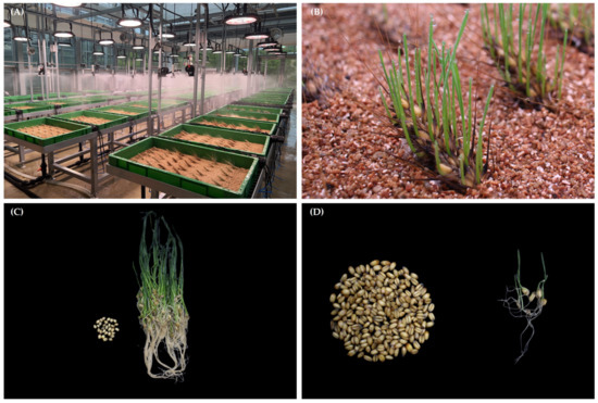 Pre-harvesting sprouting (PHS) is a phenomenon in which germination inhibitors are dissolved in the kernels or spikes under frequent rainfall and excessive moisture conditions, breaking seed dormancy and resulting in germination before harvest [,,,]. PHS is a major problem that severely decreases the quality of wheat seeds, and this representative abiotic stress has caused critical damage worldwide, notably in East Asia [,,]. In the Korean wheat cultivation environment, a drastic increase in temperature in the rainy season during the harvest period leads to PHS. Therefore, understanding the PHS mechanism during the grain development stage is one of the most important research aspects in the wheat breeding field []. Additionally, a physiological and genetic understanding of seed development, germination, and dormancy is necessary to address the problem of moisture stress.