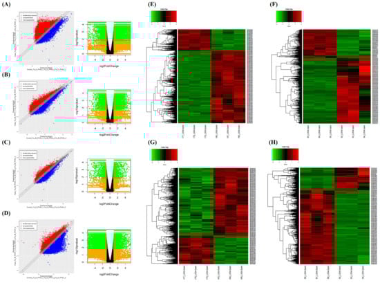 Scatter plot, volcano plot, and heatmap analysis of differentially expressed genes (DEGs) in K0 vs. K7, W0 vs. W7, K0 vs. W0, and K7 vs. W7 groups. (A) Scatter plot and volcano plot of the K0 vs. K7 group, (B) scatter plot and volcano plot of the W0 vs. W7 group, (C) scatter plot and volcano plot of the K0 vs. W0 group, (D) scatter plot and volcano plot of the K7 vs. W7 group, (E) heatmap analysis for DEGs in the K0 vs. K7 group, (F) heatmap analysis for DEGs in the K0 vs. K7 group, (G) heatmap analysis for DEGs in the K0 vs. W0 group, and (H) heatmap analysis for DEGs in the K7 vs. W7 group. The X-axis and Y-axis of the scatter plot represent a control group and a case group, respectively, and the value of the axis is the average of the values normalized on a log2 scale. Red dots indicate more than a doubling of upregulated DEGs, and blue dots indicate more than a doubling of downregulated DEGs. Gray dots indicate no differential expression. The volcano plot is expressed as a p-value derived from the log2 fold change of the expression value for each comparison group and the average comparison between the two groups. The X-axis represents log2 fold change; Y-axis represents −log10 p-value. Heatmap analysis was performed on differentially expressed genes in each comparison group, and the expression was adjusted to p-value < 0.005. Red indicates upregulation and green indicates downregulation.