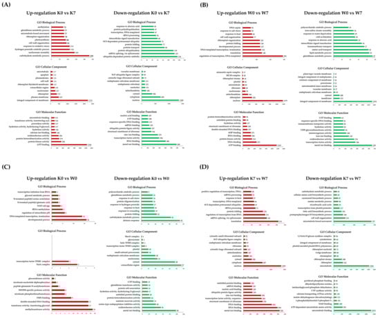 Gene Ontology analysis in DEGs for the K0 vs. K7, W0 vs. W7, K0 vs. W0, and K7 vs. W7 groups. Upregulation (red) and downregulation (green) are shown for each group, and GO terms belonging to the categories of biological processes, cellular components, and molecular functions are indicated. The X-axis represents the number of annotated DEGs, and the Y-axis lists the 10 most annotated GO functions by category. (A) Annotated up-/downregulated GO terms in K0 vs. K7. (B) Annotated up-/downregulated GO terms in W0 vs. W7. (C) Annotated up-/downregulated GO terms in K0 vs. W0. (D) Annotated up-/downregulated GO terms in K7 vs. W7. The volcano plot is expressed as a p-value derived from the log2 fold change of the expression value for each comparison group and the average comparison between the two groups. The X-axis represents log2 fold change; the Y-axis represents −log10 p-value. Heatmap analysis was performed on differentially expressed proteins in each comparison group.