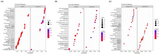 KEGG (Kyoto Encyclopedia of Genes and Genomes) pathway analysis for PHS-treated K0 vs. K7, W0 vs. W7, and K7 vs. W7 groups. GeneRatio on the X-axis is the ratio of the enhancement targets in the pathway to all targets annotated with KEGG, and the Y-axis lists the relevant functions. Each control group was divided into “activated” and “suppressed”. The size of the dot indicates the number of targets that could be annotated in the KEGG database, and the significance of the analysis was indicated by the p.adjust value. (A) KEGG analysis associated with identified DEGs in the K0 vs. K7 group. (B) KEGG analysis associated with identified DEGs in W0 vs. W7. (C) KEGG analysis associated with identified DEGs in the K7 vs. W7 group.
