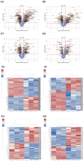 Volcano plot and heatmap analysis of differentially expressed proteins (DEPs) in K0 vs. K7, W0 vs. W7, K0 vs. W0, and K7 vs. W7 groups. (A) Volcano plot of the K0 vs. K7 group, (B) volcano plot of the W0 vs. W7 group, (C) volcano plot of the K0 vs. W0 group, (D) volcano plot of the K7 vs. W7 group, (E) heatmap analysis for DEGs in K0 vs. K7 group, (F) heatmap analysis for DEGs in the W0 vs. W7 group, (G) heatmap analysis for DEGs in the K0 vs. W0 group, and (H) heatmap analysis for DEGs in the K7 vs. W7 group.