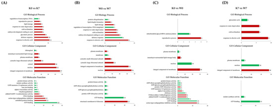 Gene Ontology comparisons with respect to cultivars and duration of PHS treatment in proteome analysis. GO analysis was performed on DEPs identified in the K0 vs. K7, W0 vs. W7, K0 vs. W0, and K7 vs. W7 groups, and GO terms belonging to the categories of biological processes, cellular components, and molecular functions are indicated. The upregulated (red) and downregulated (green) terms were divided by group. The X-axis represents the number of annotated DEPs, and the Y-axis lists GO functions by category. The number of GOs performed with DEPs was comparatively smaller than that of the GOs performed with DEGs, and so both the up- and downregulated entries are displayed in one graph. (A) Annotated GO terms in K0 vs. K7, (B) annotated GO terms in W0 vs. W7, (C) annotated GO terms in K0 vs. W0, and (D) annotated GO terms in K7 vs. W7.