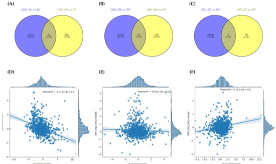 Correlation analysis between proteome and transcriptome by DEG/DEP expression correlation Venn diagram (A–C). DEG_comparison group and DEP_comparison group indicating DEGs/DEPs identified at p-value < 0.005, respectively. (A) Intersecting DEGs/DEPs for K0 vs. K7, (B) intersecting DEGs/DEPs for W0 vs. W7, and (C) intersecting DEGs/DEPs for K7 vs. W7. Correlation analysis between identified DEGs/DEPs in each comparison group (D–F). The X-axis is the number of undistributed proteins, and the Y-axis is the number of undistributed genes. The correlation coefficient and p-value between the transcriptome and the proteome are also shown, and each dot represents a DEG/DEP. (D) Correlation of DEGs/DEPs in K0 vs. K7, (E) correlation of DEGs/DEPs in W0 vs. W7, and (F) correlation of DEGs/DEPs in K7 vs. W7.