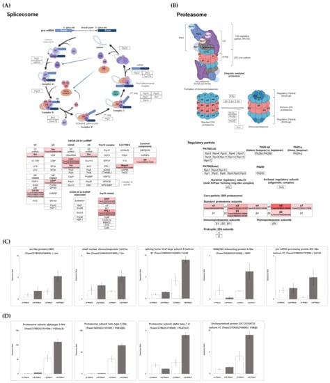 The relative expression profiles and validation of spliceosome and proteasome. The spliceosome pathway was reconstructed based on the KEGG database using Bioreder software. The expression of transcriptome related to the upregulated pathway is represented by red intensity. (A) The spliceosome pathway and its related genes represented using KEGG pathway analysis, (B) the proteasome pathway and its related genes represented using KEGG pathway analysis, (C) validation of genes related to the spliceosome pathway by qRT-PCR, and (D) validation of genes related to the proteasome pathway by qRT-PCR.