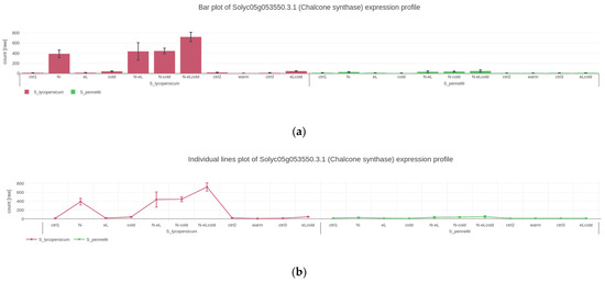 The user can generate plots showing the expression of individually selected genes. Available visualizations are bar- (Figure 2a) and line-plots (Figure 2b). In these plots, “x-axis factors” (see Section 2.1) define the position of points on the x-axis. If the user has provided “group factor” information (see Section 2.1) that further groups biological replicates, e.g., species, genotype, or different treatments. This information will be visualized by the color or position of plotted values (Figure 2; domesticated tomato S. lycopersicum in red on the left side and wild S. pennellii in green on the right side). Quantifications differing between group factors, e.g., domesticated versus wild tomato species, can either be plotted in two graphs side-by-side (Figure 2a,b) or in a single graph as differentially colored stacked curves (Figure 2c). The user can also visualize the expression of multiple genes/metabolites in the same plot using all mentioned types: bar, single, or stacked curves (Figure 2d for an example with bars). In this case, as mentioned, the color distinguishes genes while the group factors are shown in their separate graphs side-by-side. All plots are interactive in that upon hovering over data points with the mouse, the user is presented with the respective values in a little overlay window. Hovering with the mouse over a specific point will display the underlying plotted data corresponding to that point, or bar, respectively. All plots a user generates can be saved and downloaded in high quality scalable vector graphics and used for publication purposes. Furthermore, exporting the GXP data and state optionally saves generated plots and analyses as well (see Section 2.1).