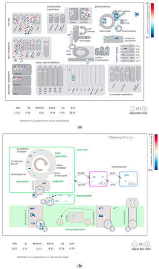 The Mapman frameworks (Mapman4 [36] and the older version Mapman v.3.6 [39]) comprise a manually curated vocabulary (ontology) to describe the function of land plant proteins. Mercator and Mercator4 [3,36] are efficient and accurate genome scale annotation pipelines that assign the descriptions of Mapman v.3.6 and of Mapman4, respectively, to query proteins or transcripts. The desktop application MapMan [1,3,36,39]) has been developed to visualize annotations of the Mapman frameworks in the context of gene expression data. Based on a proof-of-principle code [1,40] we also developed a simple MapMan web browser application. The same as in the MapMan desktop application, a user can choose one of several basic metabolic cellular sketches, e.g., “Metabolism overview”, “Photosynthesis”, or “Secondary metabolism” (Figure 4). In these sketches, small squares represent proteins or transcripts with functional annotations semantically corresponding to that region in the diagram. For example, all proteins with functions related to the Calvin cycle would appear as small boxes in the upper left area of the “Photosynthesis” sketch (Figure 4b).
