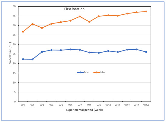 Successful grafted seedlings of cucumber on different five cucurbit rootstocks (6 weeks old) and control (non-grafted plants) were transplanted in pots under greenhouse conditions. The pots for the experiments were divided into two groups: the experiment for the first group was performed to investigate the response of grafted cucumber seedlings grown under greenhouse to Fusarium wilt disease under high-temperature stress in the late summer season, and the experiment for the second group was conducted without Fusarium infection to investigate the effect of grafting onto rootstocks on growth, yield and fruit quality of cucumber under heat stress conditions. The mean daily temperature and relative humidity (at 2 m) under the greenhouse during the growth season of cucumber reached between 26.1 and 43.0 °C (night and day) and 43.33–86.33% for the first location and 24.0 and 40.2 °C (night and day) and 42.5–88.67% for the second location, respectively. The maximum and minimum temperatures in the first location were 22.3 and 47.3 °C, and in the second location were 20.3 and 43.5 °C, respectively. The mean values for maximum and minimum air temperature are presented in Figure 7. The successful grafted cucumber plants were irrigated every day and supplied with fertilizers twice a week with suggested doses of nutrient solution, starting from the first week after transplanting.