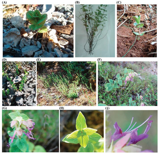 Origanum scabrum (Boiss. & Heldr.) belongs to the Lamiaceae family and it is a rare endemic plant species of Greece; it is native to Mount Taygetos and Mount Parnonas in the Southern Peloponnese as well as to Mount Dirfi in Evia island [,,]. It is a perennial, herbaceous wild plant with thin shoots (Figure 1A), while the aerial part of the plant dries up during summer (Figure 1B). Every year (usually during March) new stems are grown from the buds of the underground shoots—rhizomes (Figure 1C). The above-ground stems are erect (Figure 1D,E) growing to a height of 10–30 cm, although in some favorable environmental conditions they may exceed 40 cm []. Each node of the stem bears two opposite leaves and two axillary buds which do not always produce lateral shoots (Figure 1D,E). The leaves are simple, pointed, cordate, and smooth with characteristic stiff hairs on the periphery (Figure 1F,H), while the flowers which appear in a terminal inflorescence (Figure 1F) are small, with petals of lilac-pink color and pink—purple bract leaves at the base of each flower (Figure 1D,G).