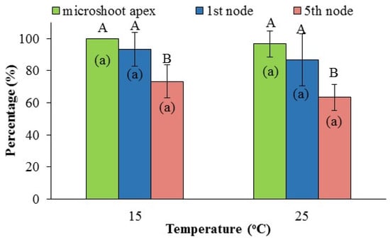 Stage I and Stage II experiments were two-factor factorial (Stage I: factor A—explant collection date, factor B—node position; Stage II: factor A—temperature, B—node position) laid out according to the completely randomized and the split-plot design, respectively. In both experiments, the two-way ANOVA showed a significant interaction between the tested factors. Therefore, the effect of each factor was estimated separately at each level of the other factor. Significance of differences between treatment was assessed by the least significant difference (LSD) test at p ≤ 0.05. In Stage II experiment, comparisons of the two temperatures at each node position were made using Student’s t-test at p ≤ 0.05.