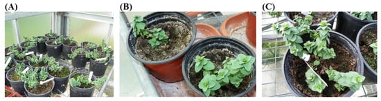 Fifty days after the start of the subcultures (Stage ΙΙ), 15 rooted microplants from each treatment (temperature x node position) were transferred to 1 L pots filled with peat (KTS2, Klasmann-Deilmann Gmbh, Geeste, Germany) that contained 280–360 mg L−1 N, 320–410 mg L−1 P2O5 and 370–460 mg L−1 K2O (1:1; v/v). Before transplantation, microplants’ roots were thoroughly washed with deionized water to remove the remains of the culture medium. The pots were placed in a “walk in” chamber with controlled conditions, e.g., constant temperature at 20 °C (16 h light/8 h dark), light intensity of 45 μMol m−2 s−1 with the use of fluorescent lamps, and average relative humidity of 80% (Figure 5A). At this stage, plantlets were covered with transparent plastic. After 15 days, plantlets were transferred to an unheated greenhouse where they remained for 45 days (Figure 5B). Then, the plantlets were transplanted into 2 L pots (Figure 5C) with the same peat substrate and remained there for further growth (temperature ranged between 11.2 and 30.8 °C). During that period, fertilization was carried out every 15 days with 50 mL aqueous solution, using 20-20-20 (N-P-K) plus trace elements (Nutrileaf, Miller, PA, USA) fertilizer at a concentration of 1 g per 10 L. After 2 months, the ex vitro survival rate (%) of plants was measured (4 months, in total, after plants transfer from the in vitro cultures).
