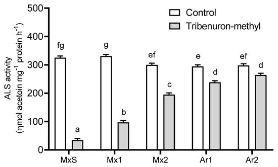 Acetolactate synthase (ALS) activity recorded in Brassica rapa populations without herbicide (control) and treated with tribenuron-methyl (10 g ai ha−1). Vertical bars represent the standard error of the mean (n = 5) and the letters above the bars indicate a statistical significance (p < 0.05).