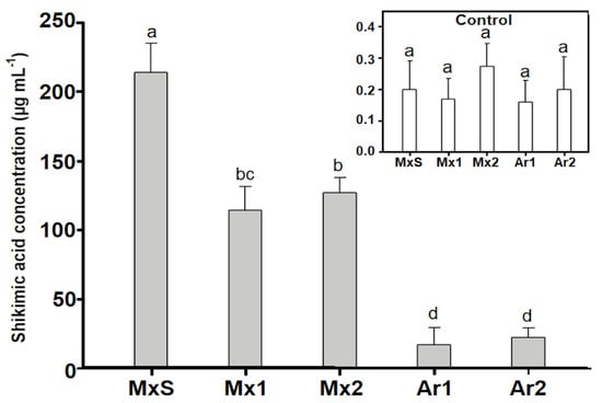 Shikimic acid concentration (µg/mL) in Brassica rapa populations without herbicide (control) and treated with glyphosate (600 g ae ha−1). Vertical bars represent the standard error of the mean (n = 5) and the letters above the bars indicate a statistical significance (p < 0.05).