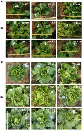 Phenotypes of the orange Chinese cabbage at rosette stage and mid-head stage. (A) Rosette phenotype (S2). (B) Metaphase phenotype (S4).