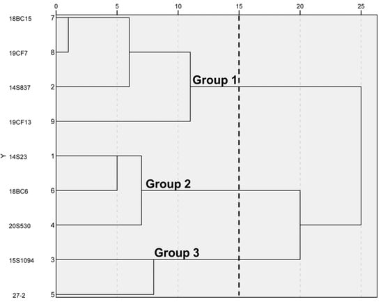 Clustering diagram of 9 Chinese cabbage lines by the shapes of the leaf head. Phenotypic relationships between the lines were derived from the Euclidean distance (ED). The 9 lines were divided into 3 clusters.