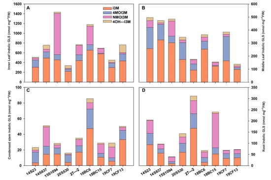 GLS accumulation among various tissues is crucial for understanding the changes in their transport from source to sink [,], as GLSs could be transported from leaf sites to roots and inflorescence []. In Arabidopsis thaliana (L.) Heynh., both rosette leaves (or inflorescences) and roots can synthesize indolic GLSs []. The total GLS content of different tissues in Chinese cabbage was identified in the following order: seed > flower > young leaves > stem > root []. Total GLS content was found to be greater in turnip compared with cauliflower, followed by white-headed cabbage sprouts []. However, studies on the indolic GLSs of non-edible organs of orange Chinese cabbage have not yet been reported.