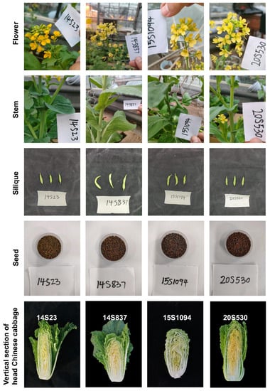 The phenotypes of flowers, stems, siliques, seeds, and longitudinal sections of leaf heads in orange Chinese cabbage lines 14S837, 15S1094, and 20S530 together with the common line 14S23 as the control.