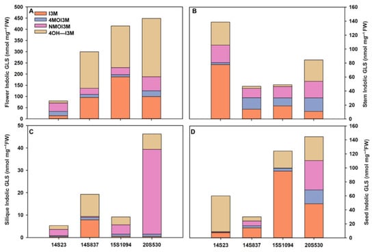 Furthermore, we also selected orange Chinese cabbage (14S837, 15S1094, and 20S530) for their indolic GLS content in reproductive growth stages (flowers, stems, siliques, and seeds) (Figure 6 and Figure 7). The indolic GLS content in floral organs and seeds was higher than that in stems and siliques (Figure 7). Specifically, the indolic GLS I3M content of control line 14S23 with dark orange flowers was lower than that in the cabbage lines with light yellow flowers (14S837, 15S1094, and 20S530). However, there is an opposite pattern of accumulation in the 14S23 stem (Figure 7A). I3M content in siliques is extremely low, and in seeds, I3M content in 14S23 is lower than that in 15S1094 and 20S530 (Figure 7C,D). The diverse patterns of tissue indolic GLS accumulation offer the potential for enhanced human nutrition in multiple tissues other than leaf tissue.