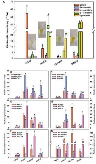 Carotenoid content in orange Chinese cabbage lines. (A) Carotenoid content, (B) light-signal-related gene expression levels (BrHY5-1, BrHY5-2, and BrPIF1). (C) MEP-pathway-related gene expression levels (BrGGPPS1, BrDET1, and BrDXS2). (D–F) Expression levels of carotenoid metabolism-related genes (BrPSY1, BrPDS, BrZDS, BrZISO, BrLCYE, BrBCH, BrZEP, BrVDE, and BrCCD4). (G) The expression levels of indolic GLS metabolism-related genes (BrCYP79B2, BrCYP79F1, and BrIGMT1). Mean values and SEs for three replicates are shown. Lowercase letters represent significance level p < 0.05.