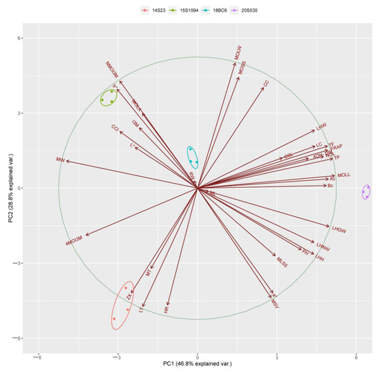 Principal component analysis (PCA) was performed to identify differences between the high indolic GLS lines (18BC6 and 15S1094) and the low indolic GLS lines (14S23 and 20S530). The 14S23, 20S530, 18BC6, and 15S1094 lines can be well differentiated along the PC1 level. The percent variance obtained for all principal components (PCs) is shown in Table S2. The first component (PC1) and the second component (PC2) explained 46.80% and 28.80% of the variance, respectively (Figure 9). Subsequently, we performed a correlation analysis on 15S1094 and 20S530, which were significantly different (Figure S2). Among them, the NMOI3M was negatively correlated between TP and TF in 15S1094, the I3M was negatively correlated with LC. In 20S530, the Bc was negatively correlated with HR, 4OH-I3M. Meanwhile, the NMOI3M was negatively correlated with the MOLW in the 20S530 line. Overall, the mainly indolic GLSs, carotenoids, and biological traits were negatively correlated in the 15S1094 and 20S530 lines.