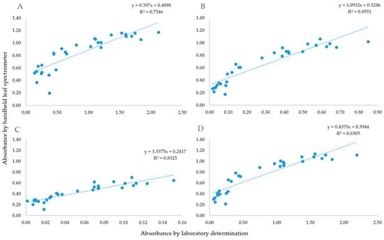 The optical density results of the laboratory determination (x-axis) and SpectraVue leaf spectrometer (y-axis) measurements at 470 nm (A), 647 nm (B), 537 nm (C) and 663 nm (D).