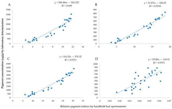 The relationship between the handheld spectrometer indices (CPHLA, CPHLB, CPHLT and CRI 2) and laboratory pigment determination process was as follows: (A) CPHLA—chlorophyll-a; (B) CPHLB—chlorophyll-b; (C) CPHLT—total chlorophyll; (D) CRI 2—carotenoid content.