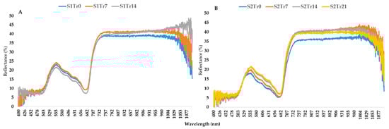 Changes in reflectance patterns under two seasons: (A) spring; (B) autumn. Every line contains the data for 16 genotypes with 10 replications.