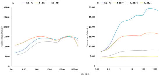 According to Table 2, the temperature regime was steady during the experimental observations in the spring but significantly decreased in the autumn. This difference between the two seasons is illustrated well by Figure 3 and Figure 4. In comparison to autumn, spring shows a narrower range of mean reflectance values, which is confirmed by the chlorophyll-a fluorescence intensity. However, the second season shows more pronounced differences across the treatments (Figure 4B). These differences were proven by the results of the PCA analysis (Figure 5). It showed high sampling adequacy (KMO = 0.688, sig < 0.001) and two extracted components explained 61.86% of the total variance. The controls of the seasons (S1Tr0 and S2Tr0) reached the highest values for the second component. With the decrease in temperature, the values decreased too. Due to the consistent temperature regime, variations between the three spring treatments (S1) could not be noticed. However, in autumn (S2), the measurements significantly differed from each other. Altogether, the data from the spring observations are useable as repeated information to assess the varieties’ overall performance, while the data from the autumn observations are more suited to calculating the relative decrease in the parameters.