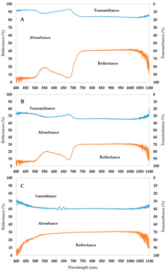 In normal conditions, plants have a broad absorbance range of visible light spectra (400–700), with the local minimum at 546 nm and the peak at 672 nm. Above 700 nm, the leaf absorbs less light because of the high amount of reflected and transmitted light. Beyond 1050 nm, there is an increasing trend in terms of the absorption intensity (Figure 6A). Under cold stress (Figure 6B), the absorbance rate was narrower than for the control. This was caused by higher amount of transmitted light at all wavelengths and the reflected light in the region of 546–672 nm. Over 700 nm, the reflection typically drops from 40% to 30%. Usually, albino plants exhibit this reflection rate throughout the entire spectrum. The transmittance of the pigmentless seedlings was at a high level throughout the whole spectrum (40%, Figure 6C).