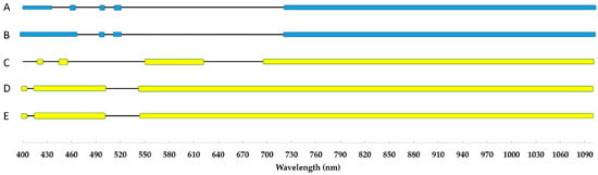 Changes of reflectance patterns under cold stress compared to the control. Each box represents significant changes from the control. The blue boxes indicate the spring measurements, the yellow ones the autumn ones. Every capital letter shows different treatment as follows: A—S1Tr7; B—S1Tr14; C—S2Tr7; D—S2Tr14; E—S2Tr21.