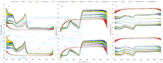 Hyperspectral data of the absorbance (A,D), reflectance (B,E) and transmittance (C,F) in spring (A–C) and autumn (D–F). The graphs represent the averages of 3 treatments (S1Tr0, S1Tr7, S1Tr14) (A–C) or four treatments (S2Tr0, S2Tr7, S2Tr14, S2Tr21) (D–F). The different colors are equivalent to different varieties.