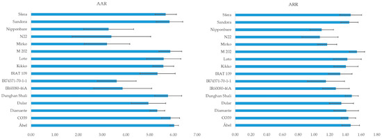 The differences between the genotypes and the albino variety at the absorbance level of 672 nm (albino absorbance ratio—AAR) and the average of the intervals of 800 and 900 nm (albino reflectance ratio—ARR).