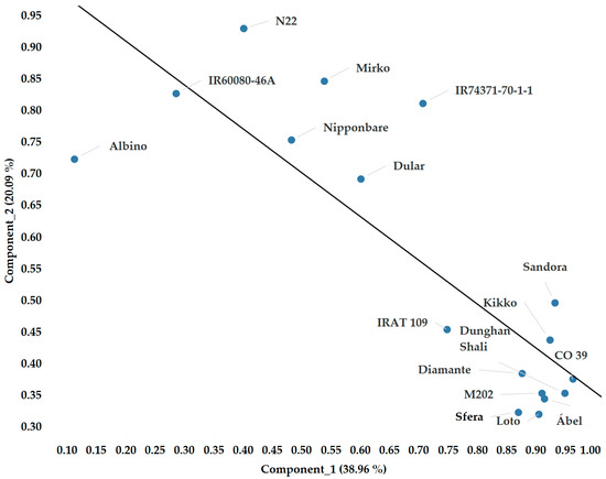 We identified two main components (Figure 10) with the principal component analysis based on all measurements and all spectral and chlorophyll-a fluorescence data across two growing seasons. The assumptions of the PCA showed a high sampling adequacy (KMO = 0.755, sig < 0.001) and correlation among the studied parameters. The two extracted components explained 59.05% of the total variance. The relationship between the two components can be explained by the linear model with high accuracy. The Pearson’s correlation value is −0.831, while the equation of the linear fitting is y = −0.6928x + 1.0471. The standard error of the slope is 0.12, the intercept is 0.09 and their t-values are −5.78 and 11.54. The significance level is <0.0001 and the average squared difference between the observed and predicted values (MSE) is 0.016 (Figure 10). If we exclude the albino plants from the linear fitting, the model tends to be more precise (MSE = 0.01). Based on Figure 10, we can separate the sensitive genotypes (IR60080-46A, N22, Mirko, Nipponbare, IR74371-70-1-1 and Dular) from the tolerant ones (IRAT 109, Diamante, Sandora, Kikko, Dunghan Shali, M 202, Sfera, Loto, CO 39 and Ábel). The performance of IRAT 109 and CO 39 showed unexpected outcomes, since the former genotype belongs to tropical japonica and the latter belongs to indica.