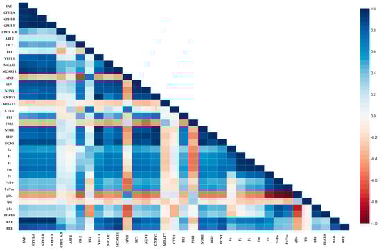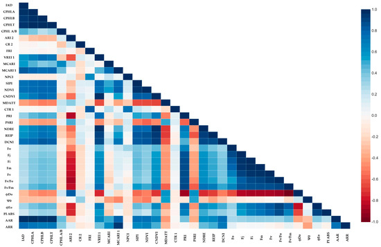 The AAR index had positive correlations with chlorophyll (CPHLA, CPHLB, CPHLT, MCARI, MCARI1 AND SIPI), nitrogen (NDRE, DCNI AND REIP) and fluorescence (Fo, Fj, Fi, Fm, Fv, Fv/Fm) parameters across two seasons (Figure 11 and Figure 12). The co-movement of chlorophyll and nitrogen has been reported by several authors [,]. This may be because the chilling temperature not only inhibits the synthetization of chlorophyll and starts its degradation [] but also limits nitrogen uptake []. Negative correlations were observed with NPCI, PSRI, ϕDo and Ψ0. The NPCI indicates the carotenoid/chlorophyll ratio, which is higher under cold stress, especially in nitrogen-limiting environments []. A similar observation can be made for the AAR, but it had lower correlations with the fluorescence parameters, except ϕDo. The plants with a greater distance from the albino variety in terms of the reflectance rate in the infrared region can absorb high-frequency light, which would cause irreversible denaturation of the protein [].