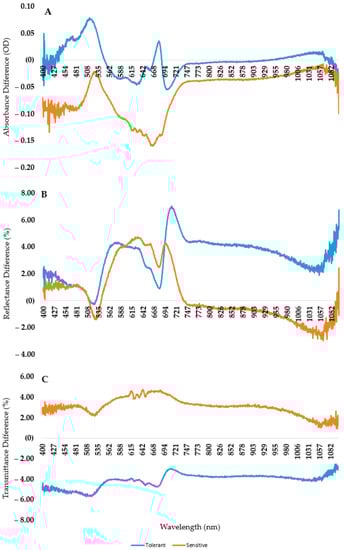 There are several evaluation methods used to perform a comparative statistical study to find the spectral bands with high correlations to the variables. Several papers reported that the evaluation of spectral band results allows a better comparison with a principal component analysis [,,,]. Using this method, we examined the entire dataset, which included data from 16 different genotypes, two seasons and both spectral and fluorescence data (Figure 10). The outcome revealed two major groups. A comparison between the two groups was also carried out. We found that the maximum absorbance value was in the 514–519 nm range in the case of the tolerant variety, while it was at 525–531 nm in the sensitive one. After the local minimum at around 630 nm, the absorbance difference was increased in the case of the tolerant variety and decreased in the sensitive ones. Therefore, the greatest difference was observed at 682 nm (Figure 13A). Similar shifted curves in reflectance were reported by Ishikawa et al. in 2015 and Obeidat et al. in 2018 [,]. However, in our results, we detected two methods of shifting in the case of reflectance. In the range of 523–680 nm, the curve shifts to the right, while above 680 nm, the curve shifts to the left. Moreover, the peak of the reflectance difference was detected at 711 nm in the tolerant varieties and at 696 nm in the sensitive ones.